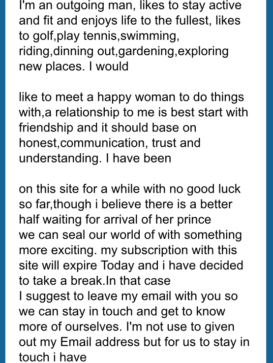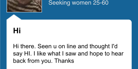 I used to answer every person who contacted me, but I think it was some kind of trick, because I rarely got a response to my response, so I don’t answer winks or interests or favorites. If you have something to say, say it in clear, grammatical English. (I speak two other languages, but let’s stick with English.) I dislike snobs, bigots, bad manners, and narrow-mindedness, this includes men who think they are hipsters (see above).